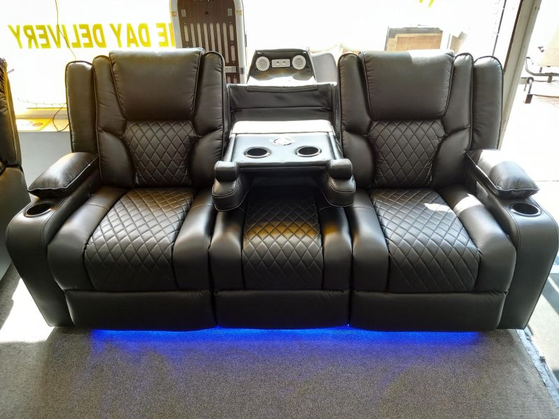 A fold down arm rest, blue under lighting, reading lamps, wireless phone charging pad, cup holders and USB charging sockets.